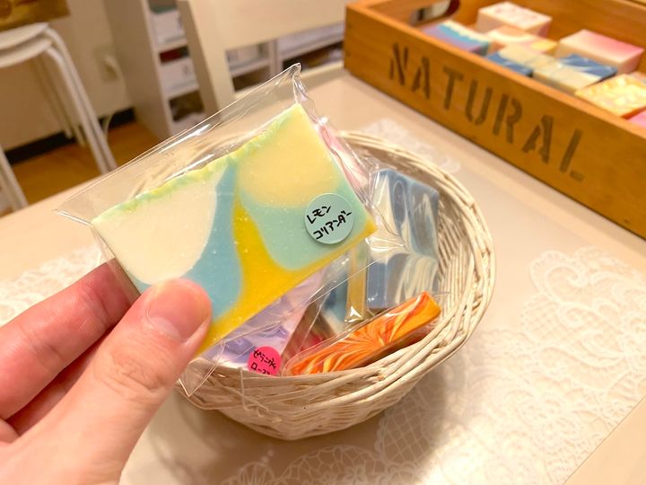 帰り際には自分で作った石けんが使えるようになるまで楽しめる石けんをプレゼントしてもらえます。見た目で選ぶもよし、香りで選ぶもよし、お好みの石けんを持ち帰ってまずは手作り石けんの良さを堪能してみて。