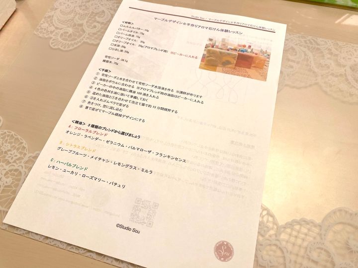 今回は参加したのは「マーブルデザイン 手作りアロマ石けん体験レッスン」7700円。まずは石けんの作り方や材料などについて講師のお話からスタートです!