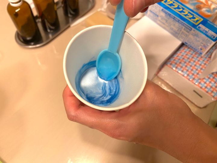 決めた色材は、紙コップに注いだオリーブオイルに溶いていきます。ダマがなくなるように混ぜるのがコツです♪