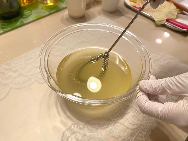 そのあとは手袋をつけて石けんの肝となる生地制作!講師が準備した苛性ソーダ水溶液と温めたボウルの油脂を合わせて、泡立て器で約15分攪拌(かくはん)していきます。