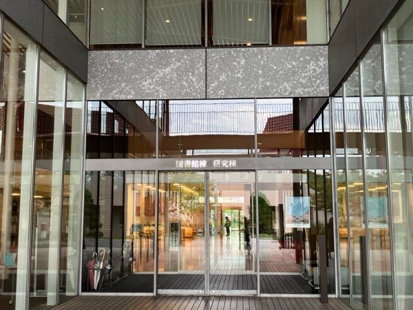 図書館棟・研究棟入口 棟の中に入って右手を見ると、お店の看板が見えます。