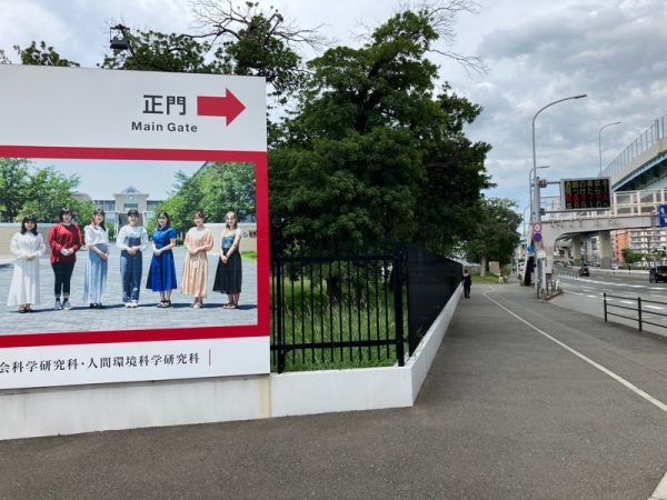 大学の近く、3号線に面したところにこの看板があります。こちらから起点して正門へ向かっていきましょう。
