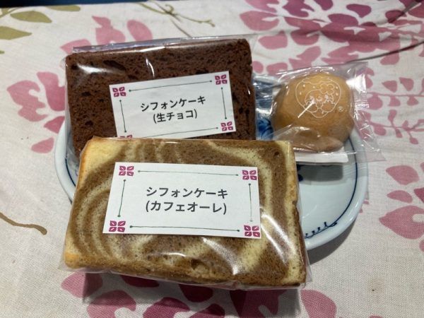 シフォンケーキ(150円)(写真中央)は、日によって種類が異なりますが2~3種類が並んでいます。写真右側はフフ(ジャムとクリームチーズをクッキー生地で包みしっとりと焼き上げた物)(150円)です。
