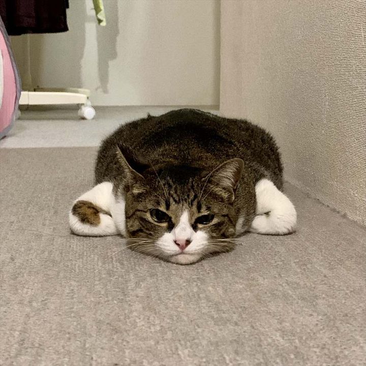 床でちょっと変わった香箱座りをしているクロエちゃん。 その姿に対して、Xでは多くの反響が寄せられていました。