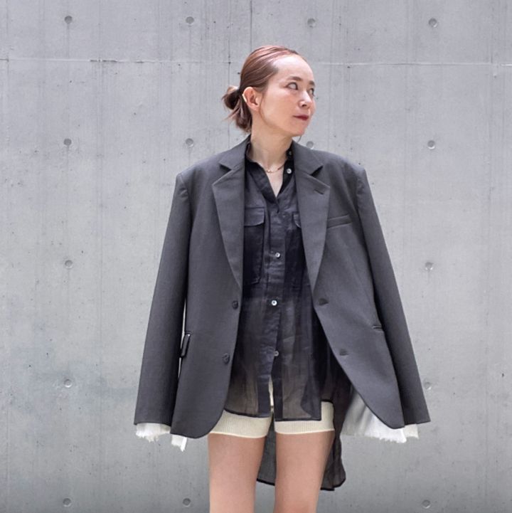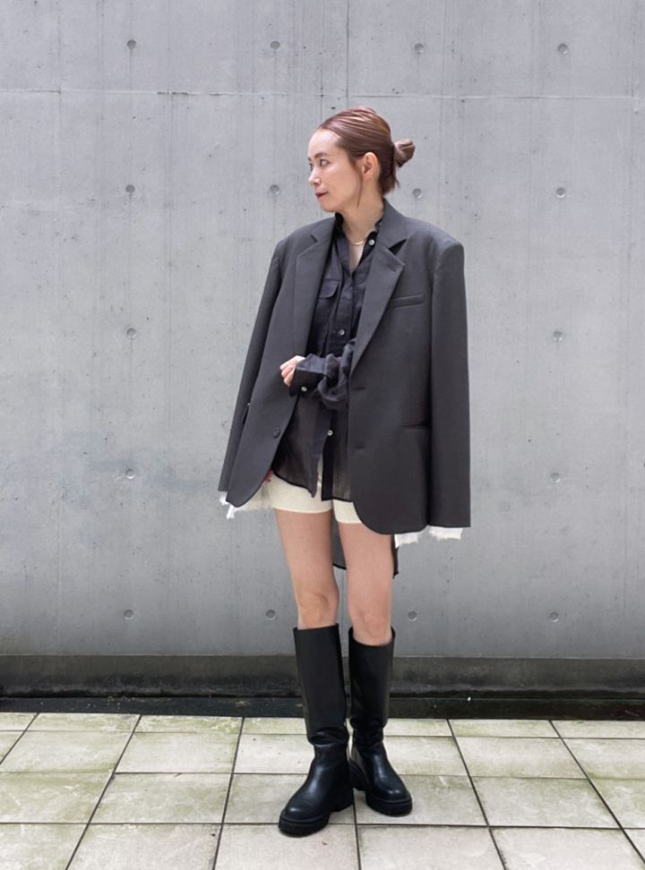 「ジャケット×ショート丈ボトムスのバランス感が大好きで、わたしの定番スタイル。Gajessのニットショーツはもたつかない丈感がおしゃれで色違いで揃えたいくらいです!」