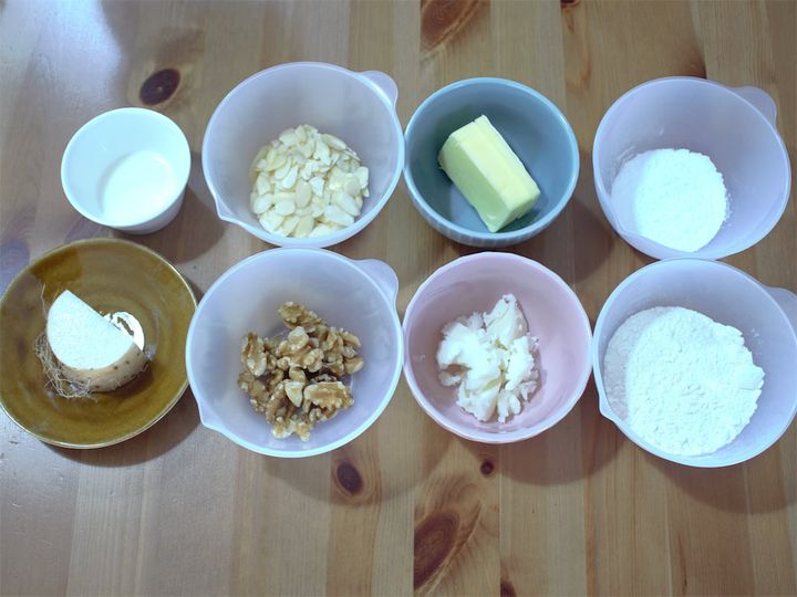 4.3に室温に戻した牛乳を加え、薄力粉と1の大和芋(長芋)を混ぜ、2のくるみとアーモンドを加えさらに混ぜる。