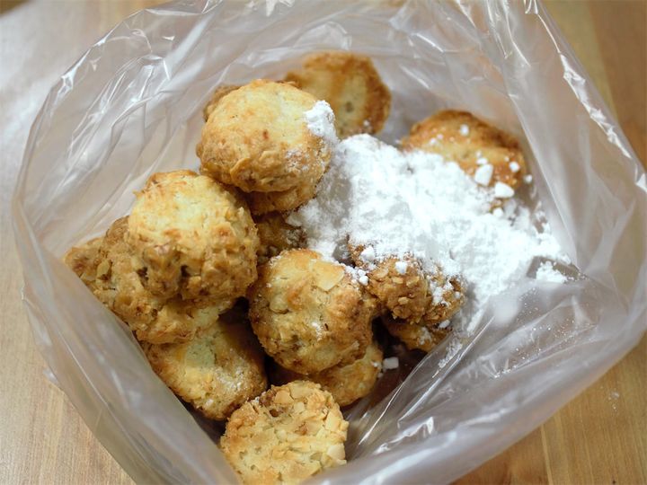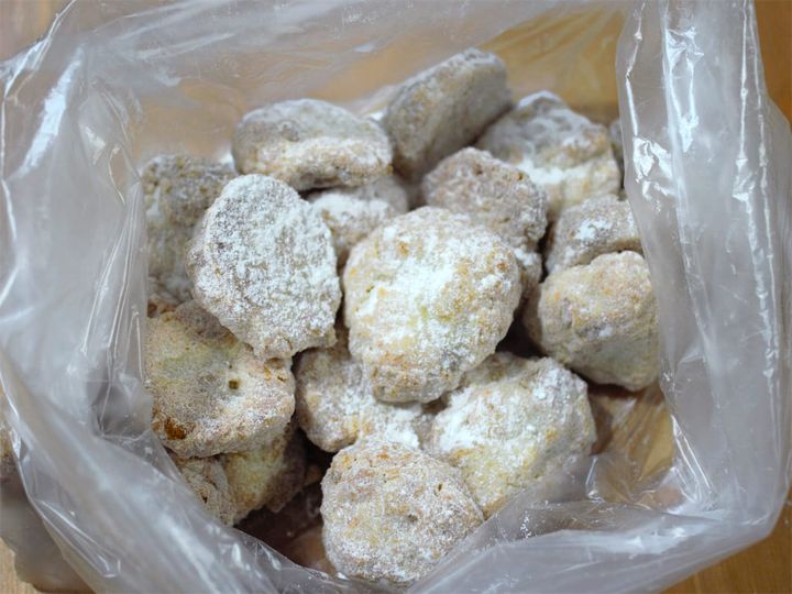 スノーボールクッキーに粉糖をまぶすときはポリ袋に入れてフリフリすると、全体にきれいにまぶせるうえ、粉糖が散らばらずに済みますよ♪