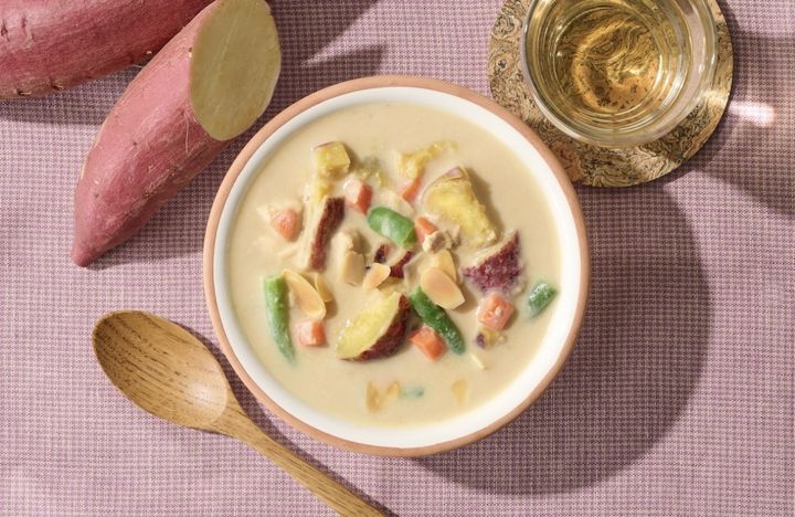 さつまいも+彩り野菜に、ローストしたスライスアーモンドの食感が楽しいアーモンドシチュー。ほかにもじっくりソテーしたオニオン、メープルシュガーやバターなどを加え、味わい深い一品に。食べ応えもたっぷり。