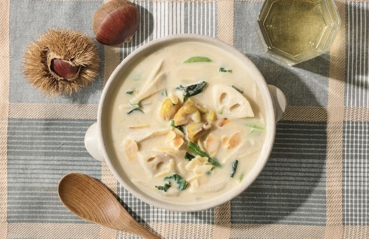 秋の代表的な味覚、ほくほくの栗とシャキシャキのごぼう、カリっとしたスライスアーモンドの食感も楽しめるアーモンドスープ。たっぷりのアーモンドペーストに、昆布やシイタケなどの和風だしと2種類の味噌や醤油麹などの発酵素材の旨みをブレンド。