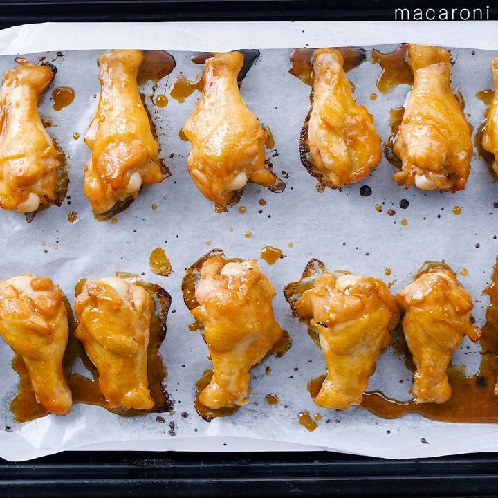 3: クッキングシートを敷いた天板に手羽元を並べ、200℃に予熱したオーブンで20分ほど焼きます。途中、漬け汁をハケで何度か塗ります。器に盛り付け、お好みでベビーリーフを添えて完成です。