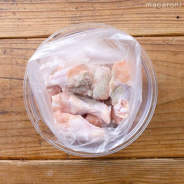1: ビニール袋に手羽元、味付け塩こしょうを入れもみこみ、下味をつけます。