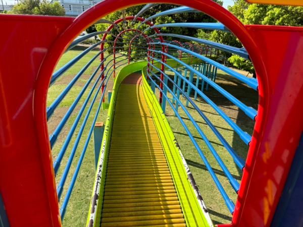 このかなりロングなローラーすべり台が春岡中央公園の代名詞らしいのですが、実はローラーすべり台以外にも魅力的なすべり台が2種類あります! まずは、グリッサンドすべり台!