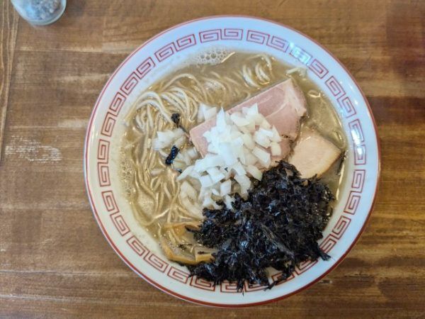 続いて相方が注文した「煮干しそば」。チャーシュー2枚と岩海苔、そして玉ねぎのみじん切りがトッピングされています。