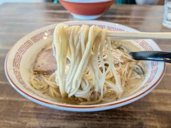 美味しいスープに温められた細麺。この細麺は京都から仕入れているようで、京都から登米市にこのスープに浸かりに来ているということです。こだわりの細麺!(太麺のメニューもあります。太麺は茨城から)
