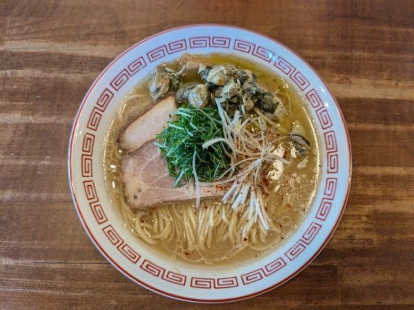 まずは、こちら「牡蠣の味噌そば」。チャーシュー2枚に大葉と白髪ねぎがトッピングされています。牡蠣の角切りがトッピングされているのが、この一杯のミソ。