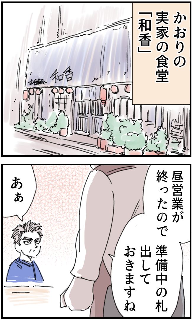 かおりさんの実家の食堂「和香」でのこと。「昼営業が終わったので、準備中の札、出しておきますね」「あぁ」お父さんに声を掛ける人の姿がありました。