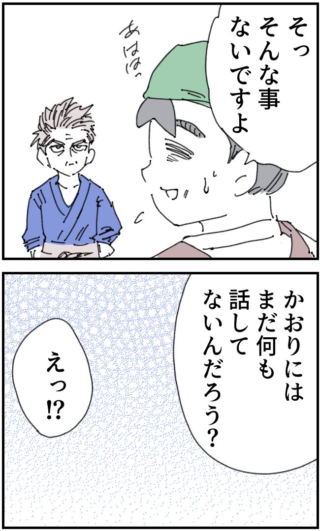 「そっ、そんな事ないですよ。あはは」笑いながら答えるいちろうさんに、「かおりにはまだ何も話してないんだろう?」とたずねるお父さん。