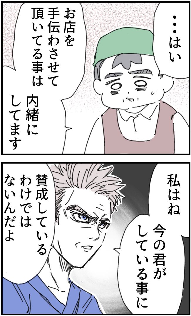 「・・はい。お店を手伝わせていただいてることは内緒にしてます」と静かに答えるいちろうさん。すると、「私はね、今の君がしていることに、賛成しているわけではないんだよ」かおりさんのお父さんがいちろうさんに言いました。