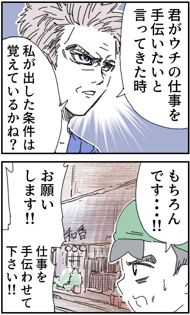 「君がウチの仕事を手伝いたいと言ってきた時、私が出した条件は覚えているかね?」とたずねるお父さん、「もちろんです・・!!」そう答えながらそのやりとりを思い出しました。「お願いします!!仕事を手伝わせてください!!」