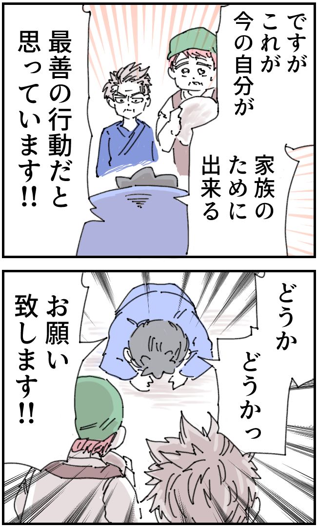 「ですが、これが今の自分が、家族のためにできる最善の行動だと思っています!!どうか・・どうかっお願いいたします!!」そう言って頭を下げるいちろうさん。