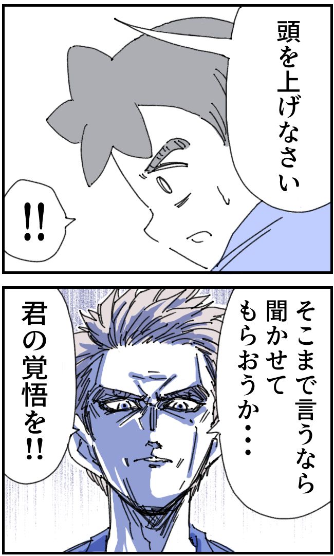 すると、「頭を上げなさい」「!!」とお父さんの声。そして「そこまで言うなら聞かせてもらおうか・・君の覚悟を!!」と凄みながら言いました。