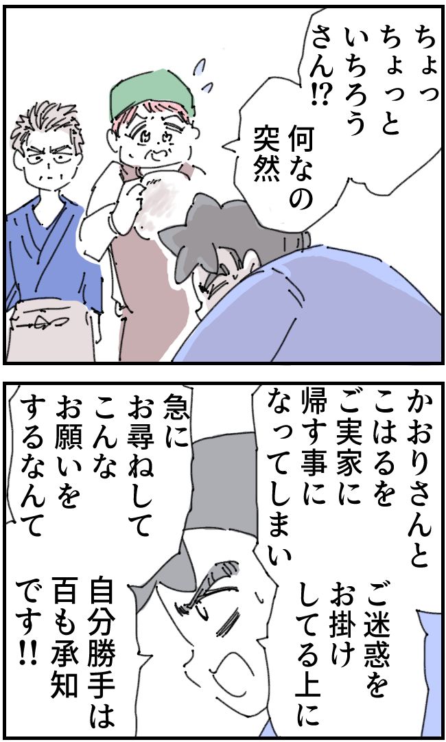 かおりさんの実家の食堂を訪ね、突然仕事を手伝いたいと言い出したいちろうさんに、「ちょっ、ちょっといちろうさん!?何なの突然」お母さんは驚いてたずねました。「かおりさんとこはるをご実家に帰すことになってしまい、ご迷惑をおかけしてる上に、急におたずねしてこんなお願いをするなんて自分勝手は百も承知です!!」頭を下げながらそう話すいちろうさん。