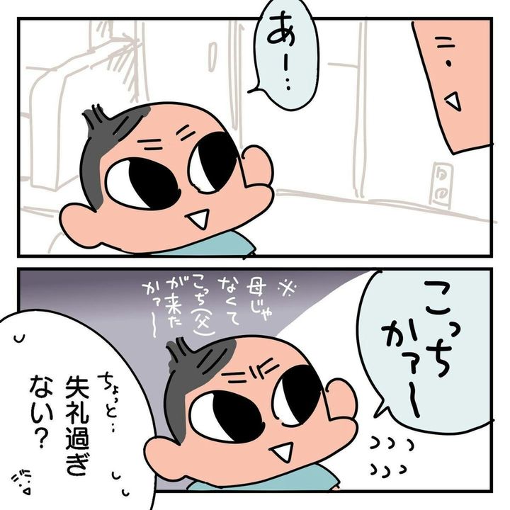 「こっちかぁ~。」残念そうにパパを見上げるつぶくん。つぶくんのストレートな物言いにパパはあ然としてしまいました。よかれと思ってママのかわりに返事したパパは、悲しい思いをすることに…。