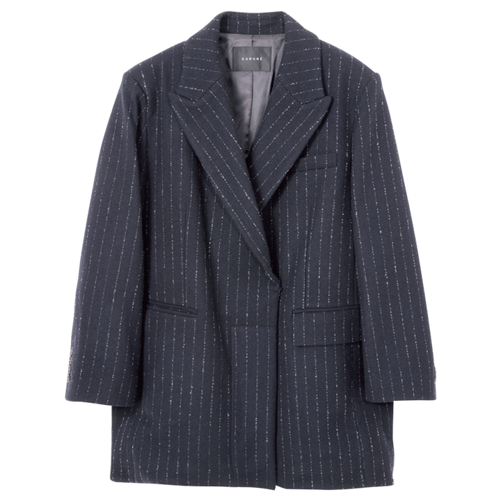 「表情のあるネップのストライプがマニッシュななかに柔らかさをプラス。ラフに羽織るだけでサマになると既に評判です。地厚でコート感覚で着用できるのも嬉しいポイント。落ち感のあるサテンスカートやミニボトムとの合わせがオススメです」(カデュネ プレス 西山怜実さん)