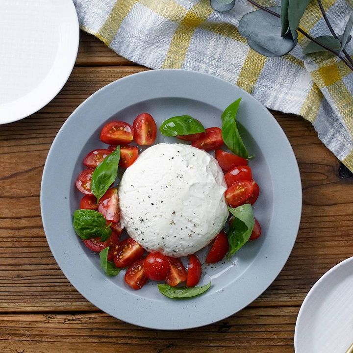 3: ②をぎゅっとしぼり皿に盛り付け、ミニトマト、バジル、塩、黒こしょう、オリーブオイルをトッピングして完成です。