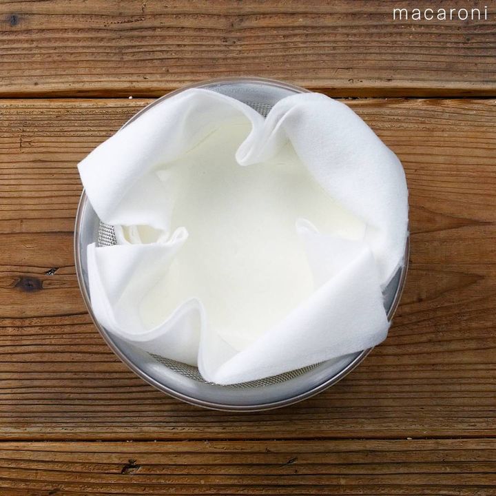2: ボウルにザルをのせてペーパータオルを敷き、ヨーグルトを入れて5時間以上水切りします。