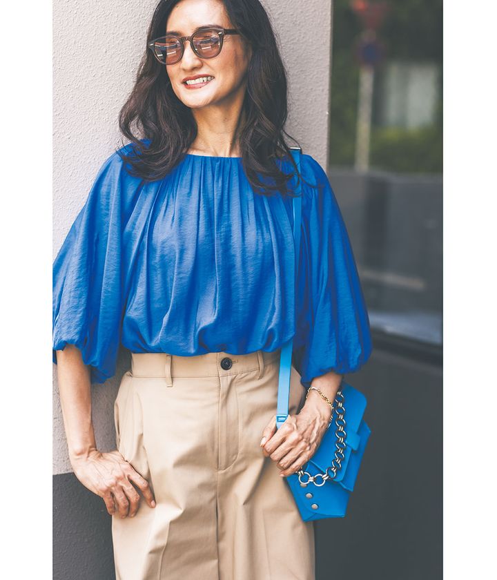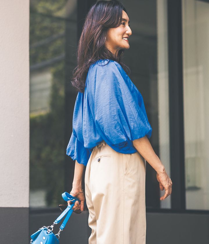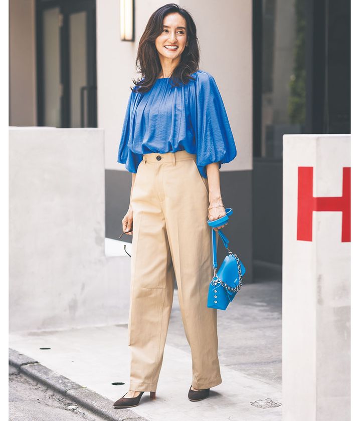 パンツ¥13,200(カリテ/カリテ スケープ コレド 日本橋店)ブラウス¥47,300(カオス/カオス丸の内)ノースリーブニット¥14,300(アルページュストーリーオリジナル)バッグ¥23,100(ノマディス/ノーベルバ)パンプス¥31,900(ツル バイ マリコ オイカワ)ピアス¥15,400〈ワンエーアールバイウノアエレ〉ブレスレット¥36,300〈ウノアエレシルバーコレクション〉(ともにウノアエレ ジャパン)リング¥12,650(ココシュニック オンキッチュ/ココシュニック) ※情報は2024年10月号掲載時のものです。