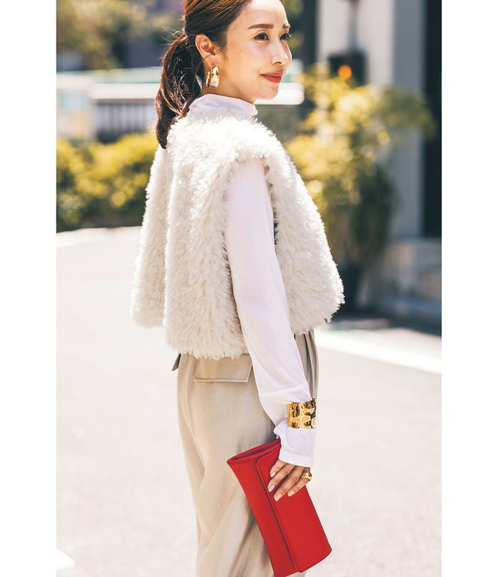 パンツ¥22,000(ジャスグリッティー)ベスト¥18,700(ミースロエ)シアーベロアプルオーバー¥9,900(セルフォード)バッグ¥5,490(MANGO)パンプス¥62,700(ブレンテッラ/アルアバイル)ピアス¥11,000(ワンエーアールバイウノアエレ/ウノアエレ ジャパン)バングル¥43,560〈ソコ〉2本セットリング¥14,300〈エムシー・スタジオ〉(ともにZUTTOHOLIC)
