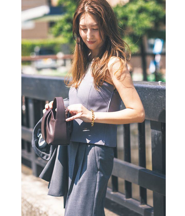 パンツ¥33,000(エストネーション/エストネーション)タンクトップ¥27,500(ハイク/ボウルズ)ビスチェ¥15,950(アンクレイヴ スタンダード/アンクレイヴ)ジャケット¥52,800(アルアバイル)バッグ¥31,900(ルメン/office. koizumi.)パンプス¥36,300(PIPPICHIC/ベイジュ)ピアス¥12,100(ワンエーアールバイウノアエレ/ウノアエレ ジャパン)ブレスレット¥16,280(ベン・アムン/ZUTTOHOLIC)