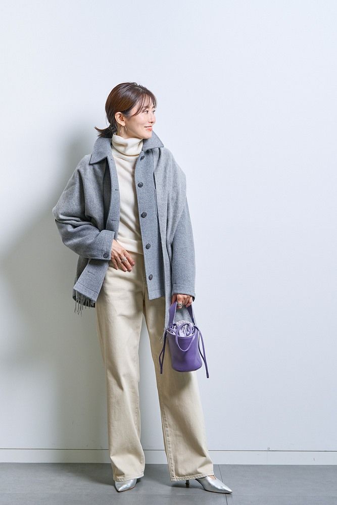 シャツディテールを取り入れた軽めアウターは、秋はTシャツの上に羽織ったり、冬はニットやシャツをレイヤードしたり、カシミヤストールを重ねれば十分な暖かさになり、暖冬の近年、長く使えるアウターだと思います。オーバーサイズでドロップショルダーになったデザインは、コーデに抜け感をプラス!お尻が隠れるくらいのショートアウターなので、パンツはもちろん、スカートとも相性よく着られておすすめです。
