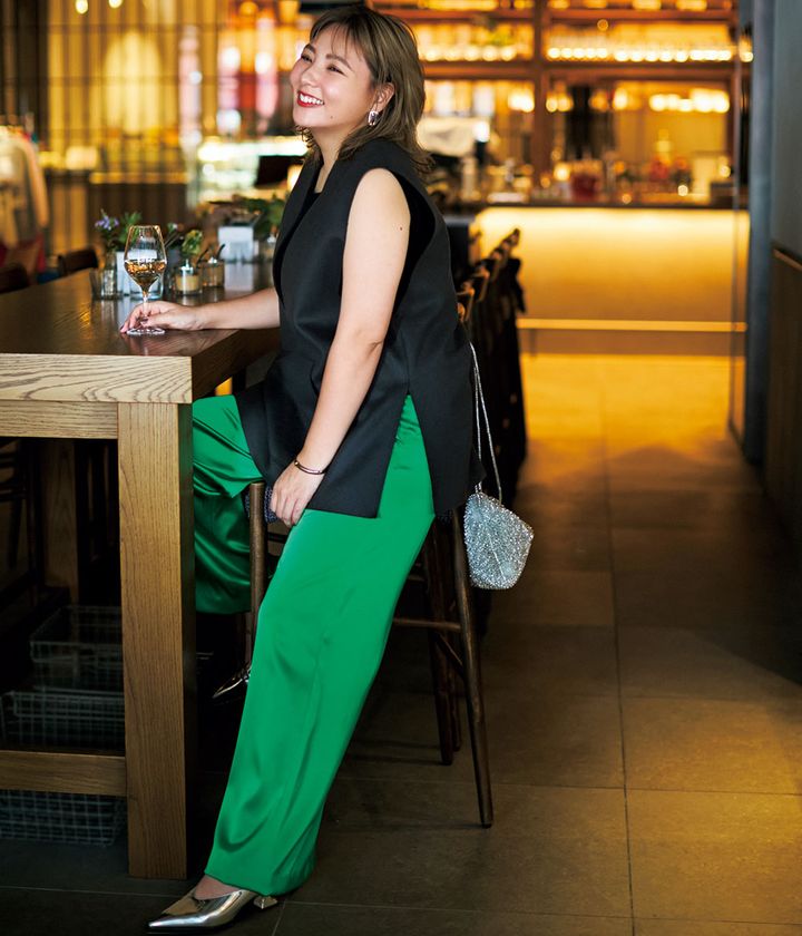 【光沢グリーン】艶感あるウールベストを投入して、より女っぽさをオン