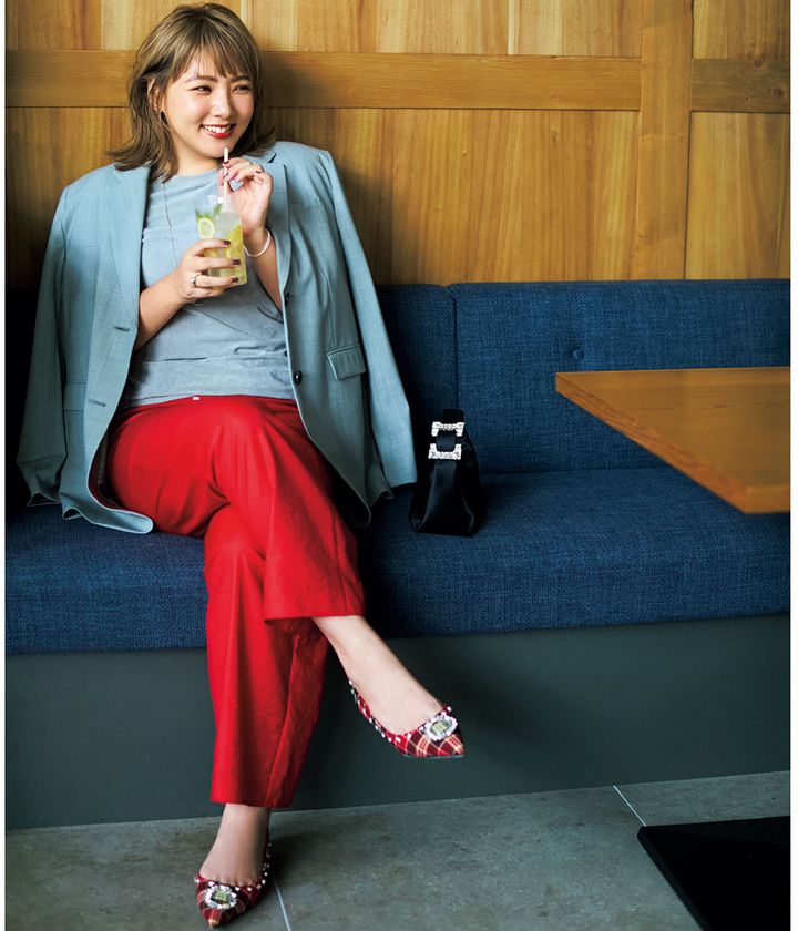 パンツ¥16,940(シップス/シップス インフォメーションセンター)ジャケット¥42,900(マイカ アンド ディール/マイカ アンド ディール 恵比寿店)タンクトップ¥9,900(ミースロエ)バッグ¥118,800(セルジオ ロッシ/セルジオ ロッシ カスタマーサービス)フラットシューズ¥31,900(ツル バイ マリコ オイカワ)イヤリング¥9,900(アビステ)ネックレス¥12,650ブレスレット¥7,700(ともにココシュニック オンキッチュ/ココシュニック)リング¥18,700(ウノアエレシルバーコレクション/ウノアエレ ジャパン)