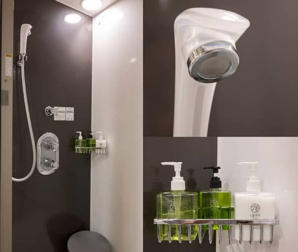 「FORUS」タイプの客室は、バスタブのないシャワーブースのみとなりますが、マイクロ・ナノバブルシャワーヘッドの「nude(ヌード)」を備えます。0.4㎜の極微細な穴から出る水と気泡が皮膚や毛穴の汚れをしっかり落としてくれので、洗っている最中から肌触りが変化。浴後もスッキリです。