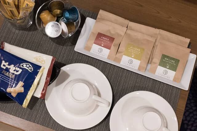 日本茶に力を入れるホテル龍名館。ネスプレッソのコーヒーマシンに加え、滞在シーンに合わせた3種類のお茶をそろえます。シャワー後に飲む “保温” をテーマにし「生姜和紅茶」や、お休み前のリラックスタイムにおすすめの「ほうじ玄米茶」。そして目覚めの一杯にぴったりの「抹茶入り煎茶」を用意。さらに旅館のようなおもてなしが感じられる “お着き菓子” は、日本橋に本店がある栄太郎の「ピーセン」です。とってもお得な気分でした。