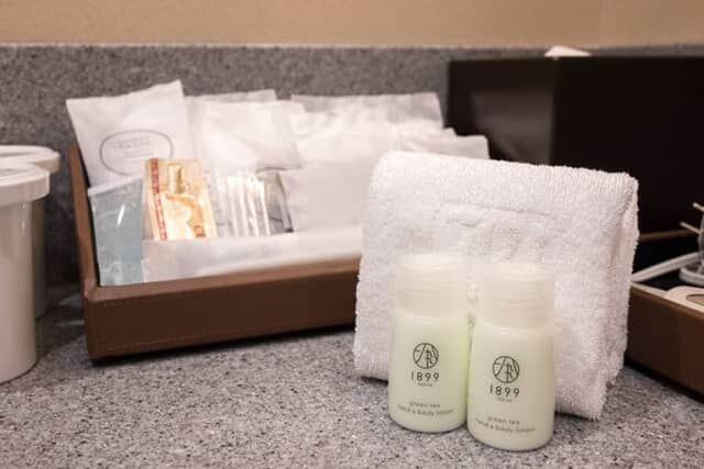 歯ブラシやコットンなどの一般的なアメニティのほかに、雪肌精の基礎化粧品や、龍名館のブランド「1899」オリジナルのボディーミルクなどもそろえます。