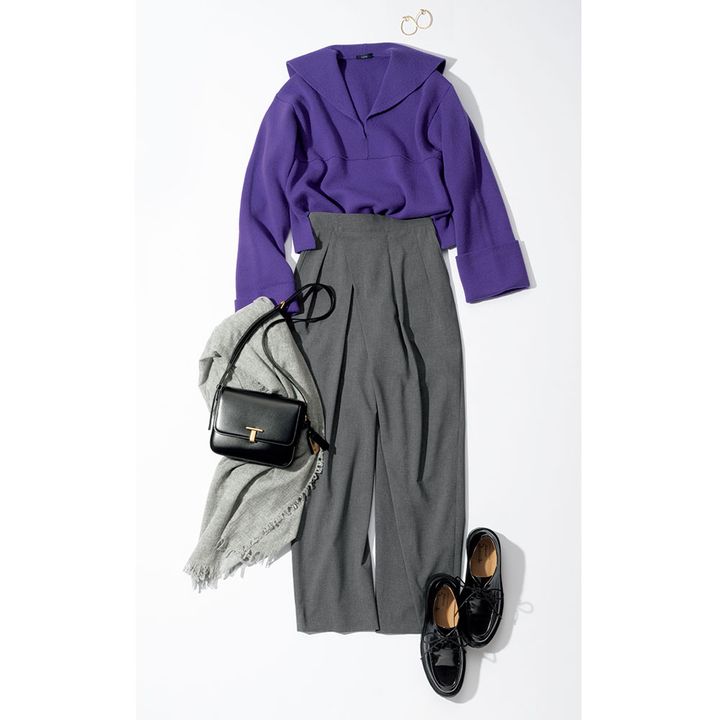 ニット¥45,100(イレーヴ)パンツ¥28,600ローファー¥25,300〈ともにアルアバイル〉ストール¥24,200〈アソース メレ〉バッグ¥62,700〈ジョイ グライソン〉(すべてアルアバイル)イヤリング¥29,700(ブランイリス/ブランイリス トーキョー)