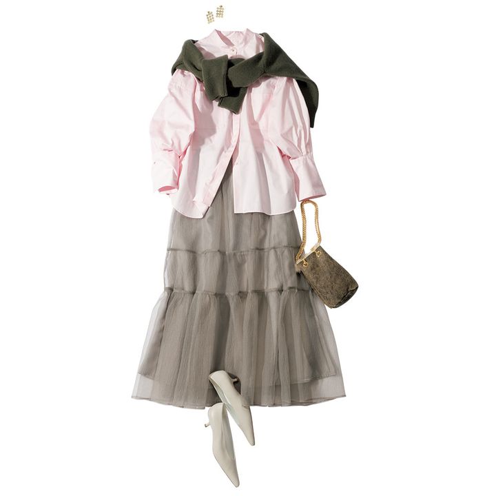 シャツ¥14,850(ルージュ・ヴィフ アンナ/ルージュ・ヴィフ ラクレ ルミネ有楽町店)ニット¥97,900(ebure/LITTLE LEAGUE INC.)チュールスカート¥20,900(アルページュストーリー/アルページュストーリー プレスルーム)バッグ¥48,400(カルス/アマン)パンプス¥64,900〈ブレンテッラ〉ピアス¥41,800〈サスキアディツ〉(ともにハウス オブ ロータス)