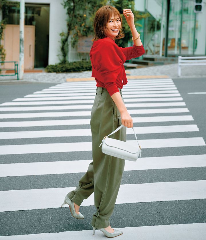 ニット¥39,600肩に掛けたニット¥53,900(ともにエイトン/エイトン青山)パンツ¥22,000(アンド アールシー/カレンソロジー二子玉川)バッグ¥141,900(J&M デヴィッドソン/J&M デヴィッドソン カスタマーセンター)パンプス¥71,500(ペリーコ/アマン)ピアス¥30,800ブレスレット¥26,400(ともにローラ ロンバルディ/八木通商)