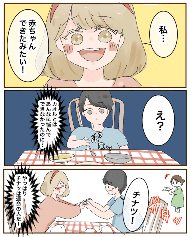 チナツはやっぱり僕の運命の人なんだ。俺は嬉しくなって、母に報告していいかを聞いた。するとチナツからは「安定期に入ってからの方がいいかも。」と言われた。確かにそうかもしれない。そう思い直した。