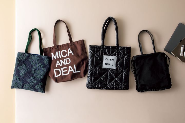 〈右から〉口をしぼると巾着にもなる2WAY仕様。少し光沢のあるしっかりとした素材でメインバッグとしても活躍。フリルバッグ〈H37×W35㎝〉¥14,300(ハーン ロデスコ/アーバンリサーチ ストア ルクア大阪店)ボディもハンドルもふわふわのパデッド仕様で肩あたりも優しい。ノートパソコンもすっぽり収納可能。バッグ〈H42×W39.5㎝〉¥3,960(CITEN/ユナイテッドアローズ カスタマーサービスデスク)大荷物派に嬉しいマチありタイプ。バッグ〈H31×W43×D13㎝〉¥3,300(マイカ アンド ディール/マイカ アンド ディール 恵比寿店)裏はブルーのベロア地。バッグ〈H36×W34㎝〉¥15,400(マニプリ)