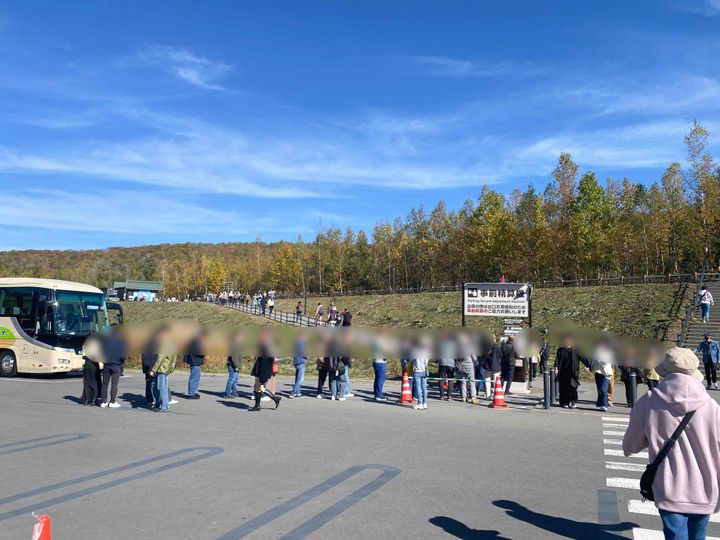 白金青い池には広々とした駐車場があり、車で訪れる際にも便利です。自家用車や観光バスが多く停まっていましたが、まだ余裕がありました。駐車場を横切って進むと、すぐ目の前に青い池が広がります。