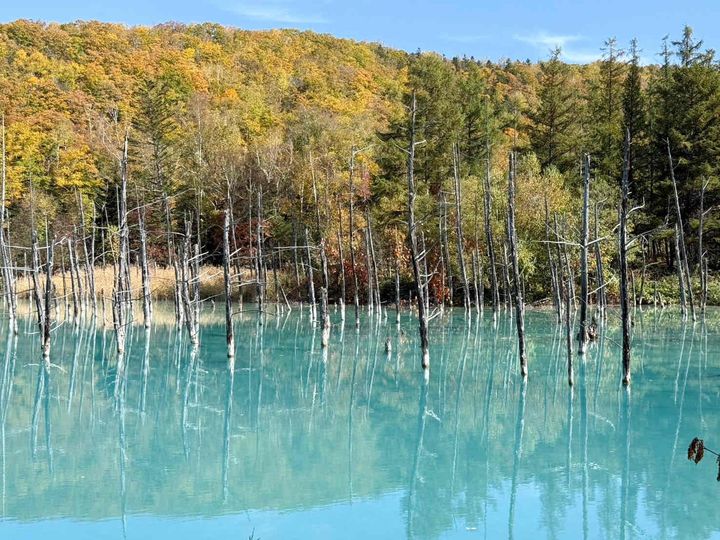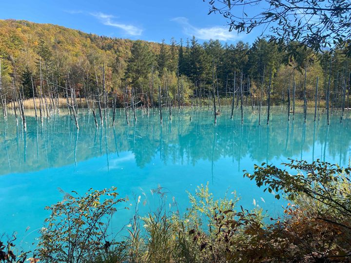 美しいブルーの水面に、すっくと立つ木々がなんとも神秘的。これは、この池に流れ込む美瑛川の澄んだ水に、白ひげの滝から流れ出るアルミニウムを多く含んだ地下水が混ざり、その結果、池の水が光に反射して青く見えるのだとか。