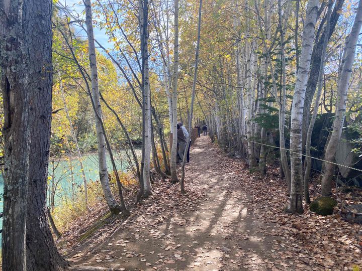 10月中旬に訪れると、ちょうど紅葉シーズンで、青い池と奥に見える黄色く色づいた木々とのコントラストがとてもすてきでした。観賞用の小道はきれいに整備されており、たくさんの人がいても快適に池を眺めることができました。