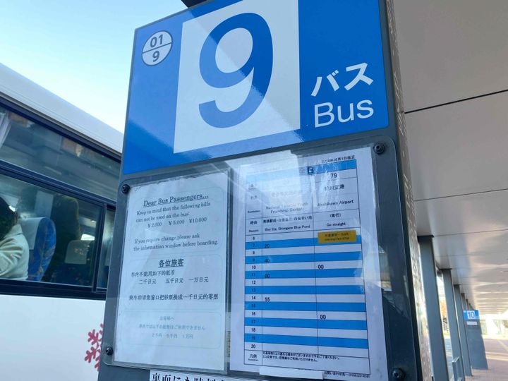 北海道・美瑛の白金青い池へは、旭川駅前から出発しているバスで向かいました。バス会社は「道北バス株式会社」、バス乗り場は9番。今年10月に時刻表が変更されたばかりなので、ネットで見つかる公式以外の時刻表を頼りに行く際は要注意です。
