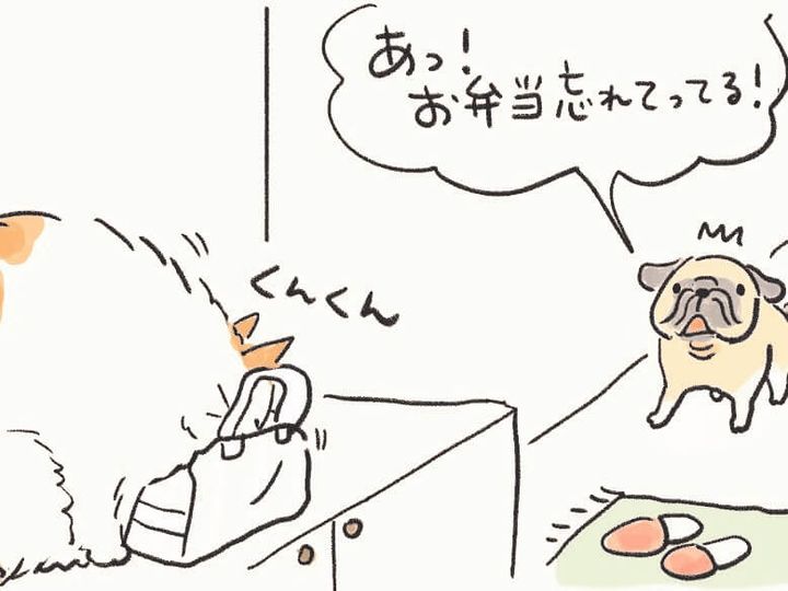 目の前のお弁当に興味津々な猫は、呼びかけに気づかず……。やれやれと頭を抱える犬なのでした。