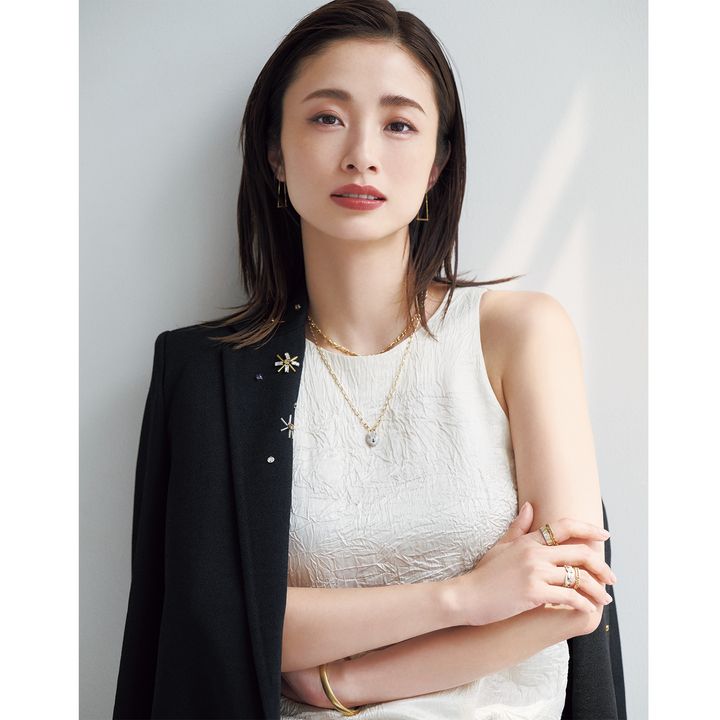 ブラウス/参考商品(デパリエ/デパリエ 伊勢丹新宿店)パンツ¥39,600(サムソ サムソ/エイト)左耳ピアス¥194,700右耳ピアス¥553,300(ともにキウナ/エスケーパーズ アナザーワールド)ネックレス(ペンダントとチェーンのセット)¥352,000(マリア ブラック/マリア ブラック 表参道店)左手人差し指リング¥242,000左手中指リング¥440,000(ともにトーカティブ/トーカティブ 表参道)タンクトップはスタイリスト私物